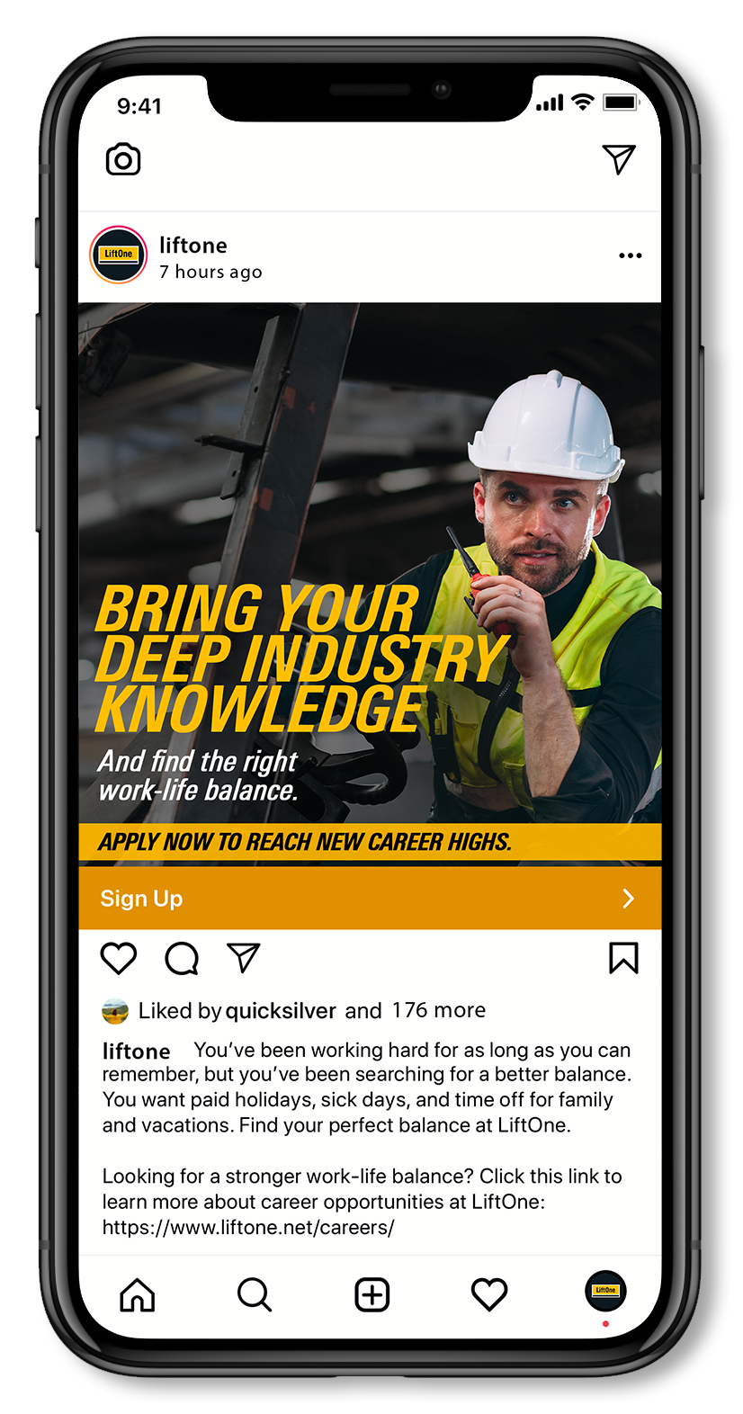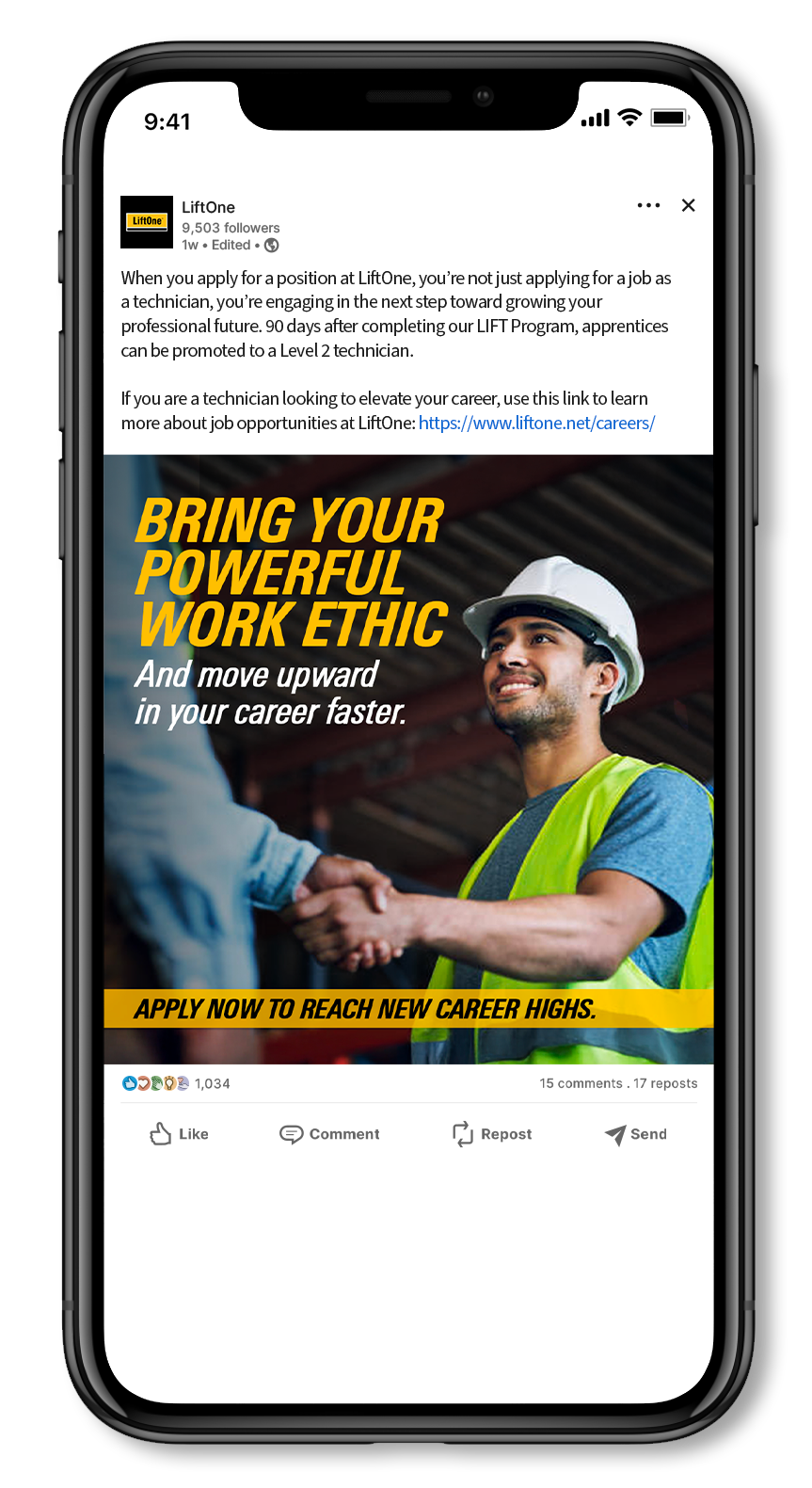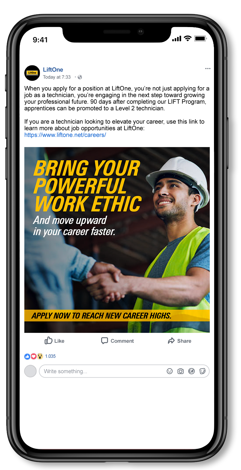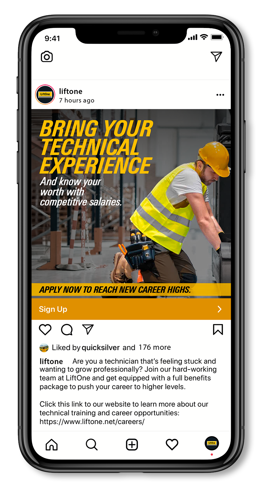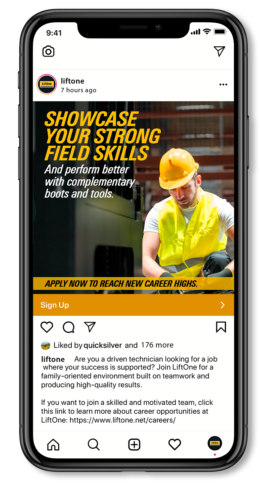Idea: LiftOne recognizes that its technicians and staff are the core of what makes its business run. It is a collaborative effort powered by a diversity of talented people. When technicians have coworkers and management working right alongside them, they will stay longer. That’s the spirit of LiftOne, a family-driven operation with an unmistakable credo that stands the test of time. LIFTONE, ALL TOGETHER.