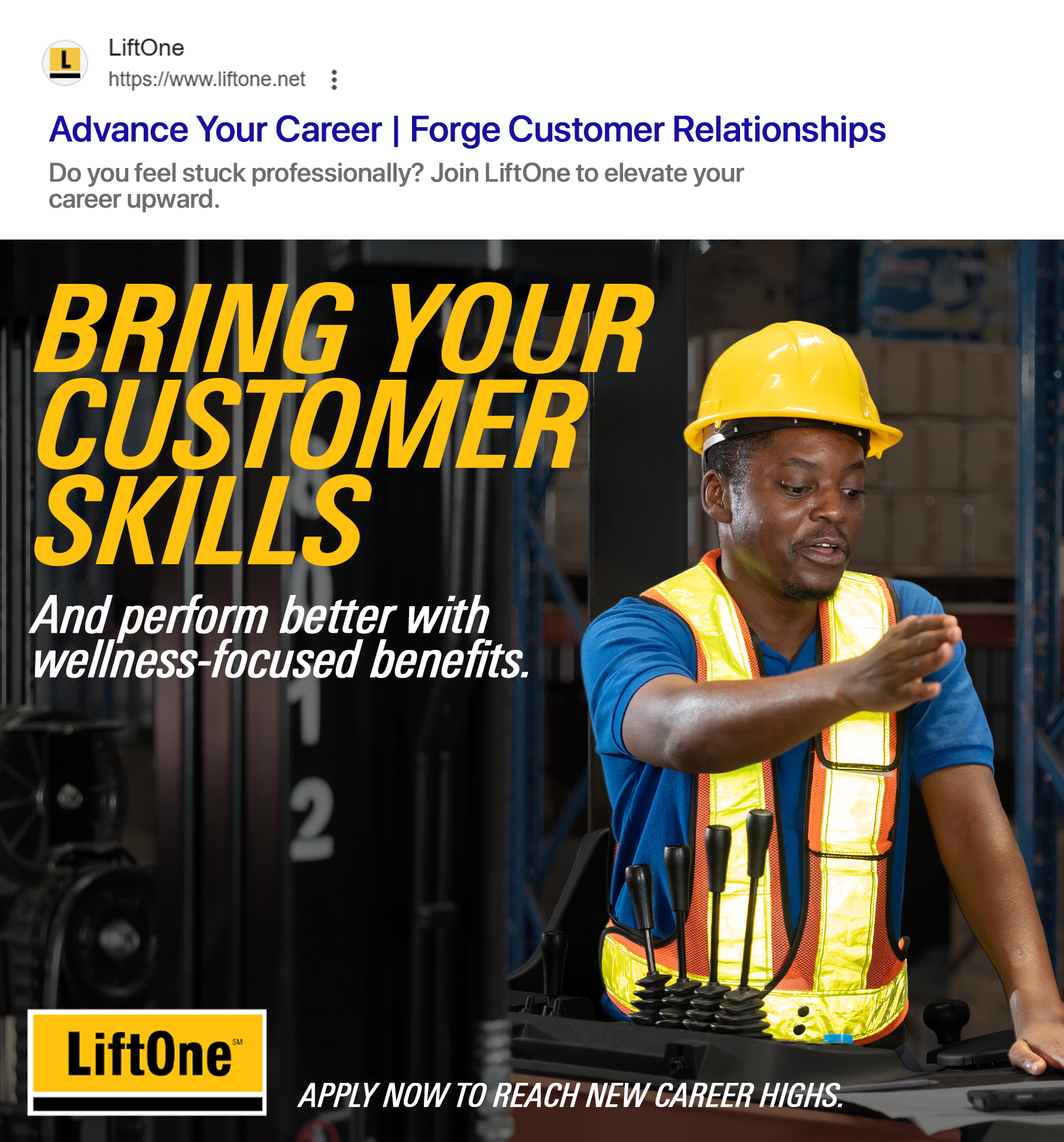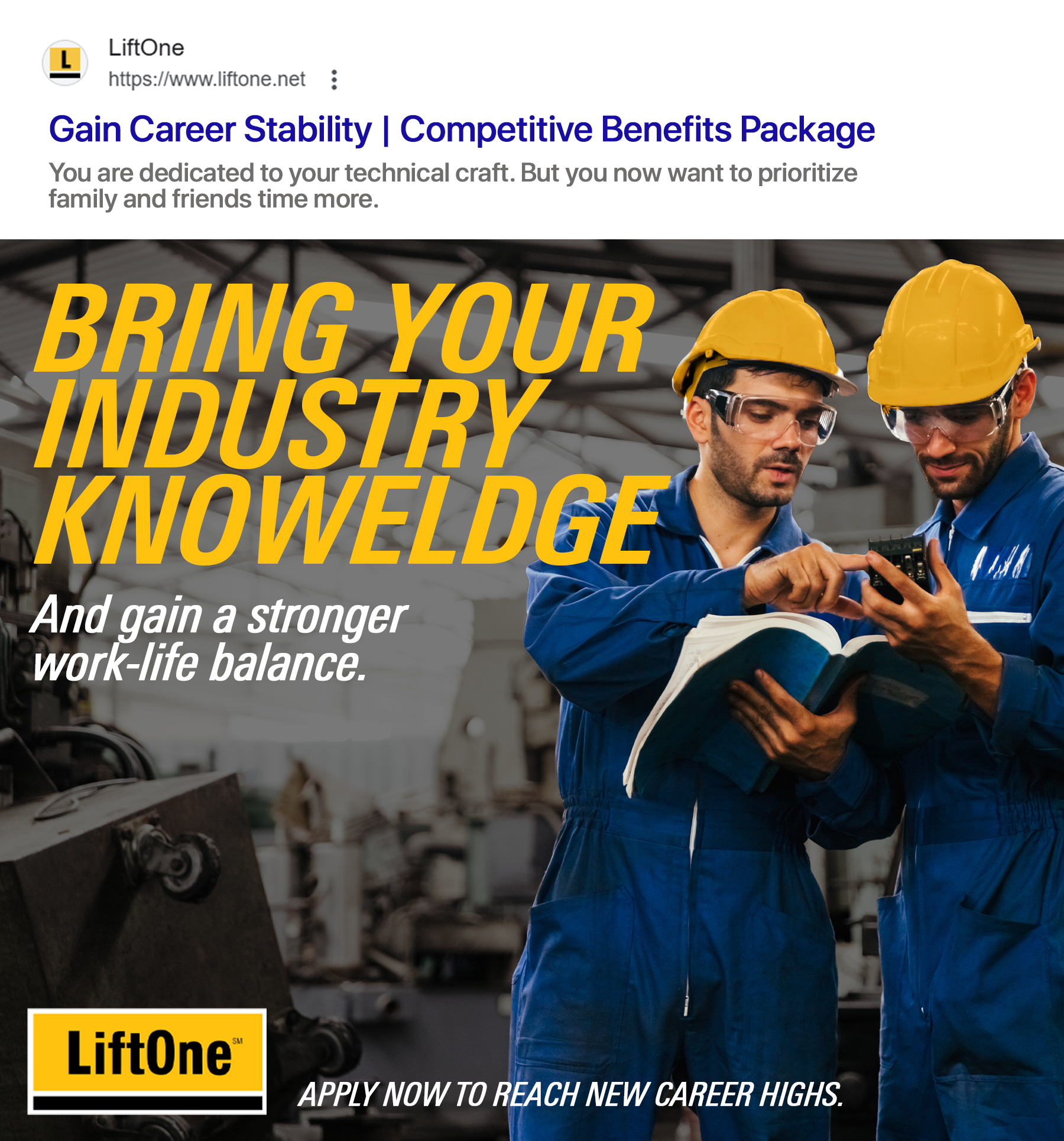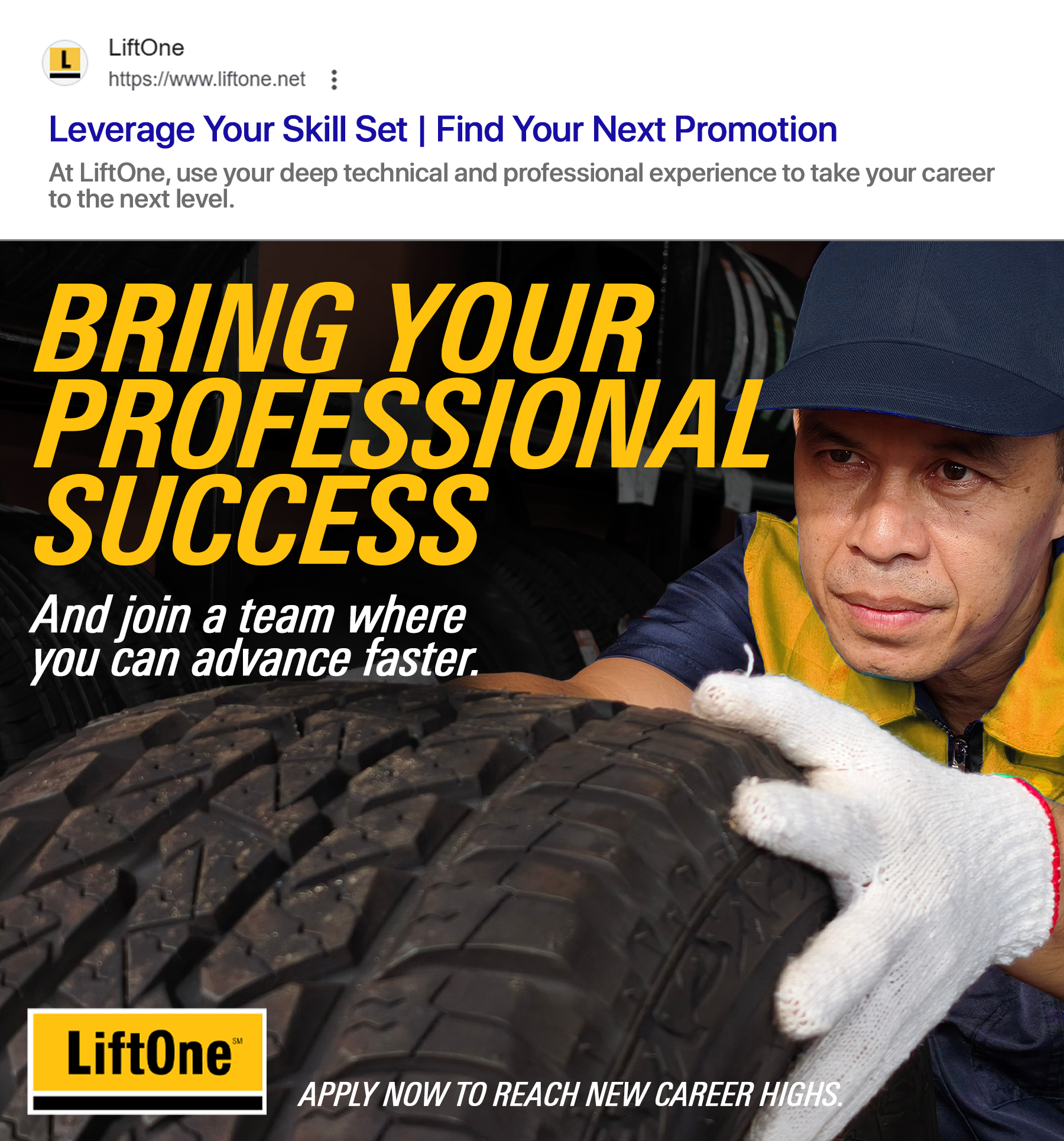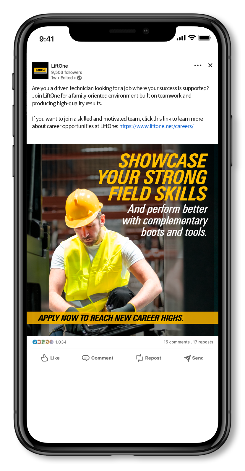 Idea: LiftOne recognizes that its technicians and staff are the core of what makes its business run. It is a collaborative effort powered by a diversity of talented people. When technicians have coworkers and management working right alongside them, they will stay longer. That’s the spirit of LiftOne, a family-driven operation with an unmistakable credo that stands the test of time. LIFTONE, ALL TOGETHER.