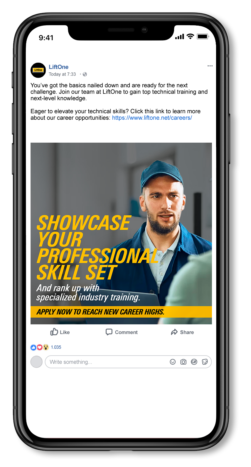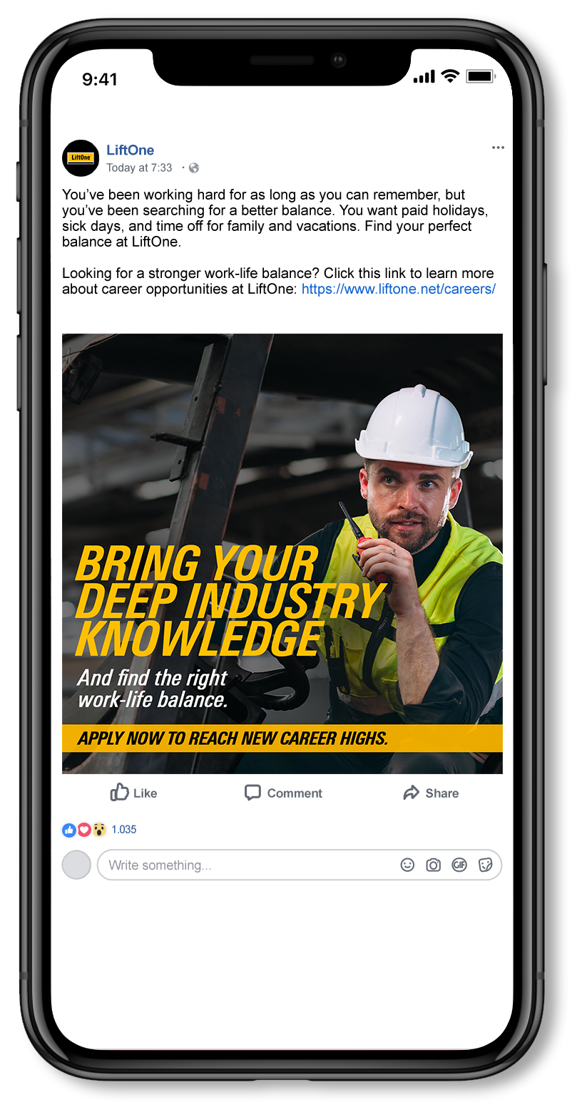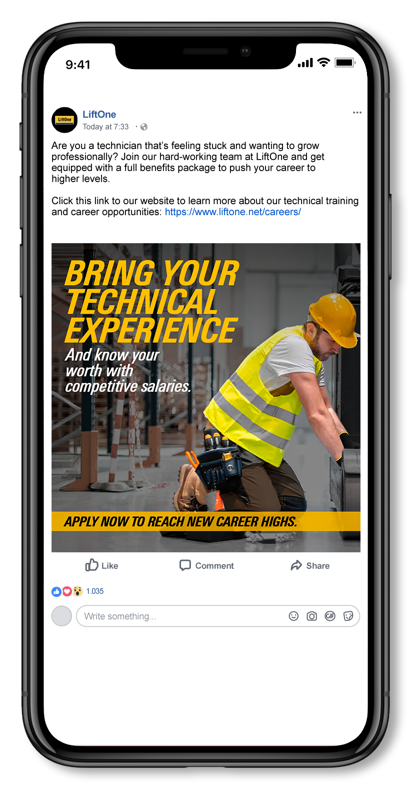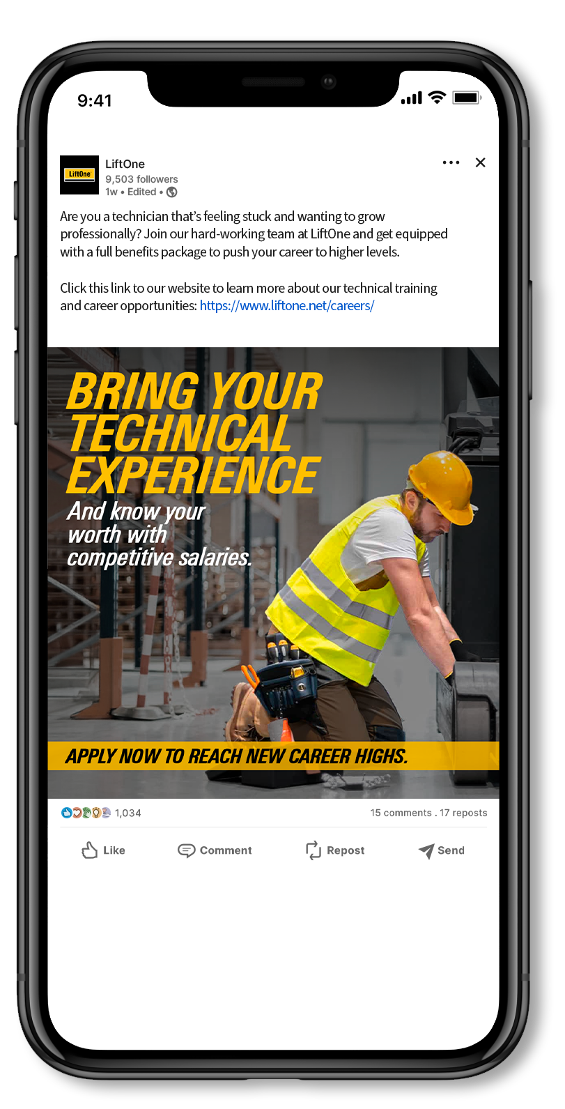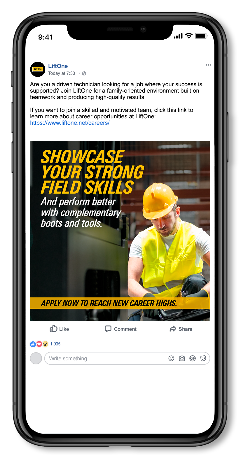 Idea: LiftOne recognizes that its technicians and staff are the core of what makes its business run. It is a collaborative effort powered by a diversity of talented people. When technicians have coworkers and management working right alongside them, they will stay longer. That’s the spirit of LiftOne, a family-driven operation with an unmistakable credo that stands the test of time. LIFTONE, ALL TOGETHER.